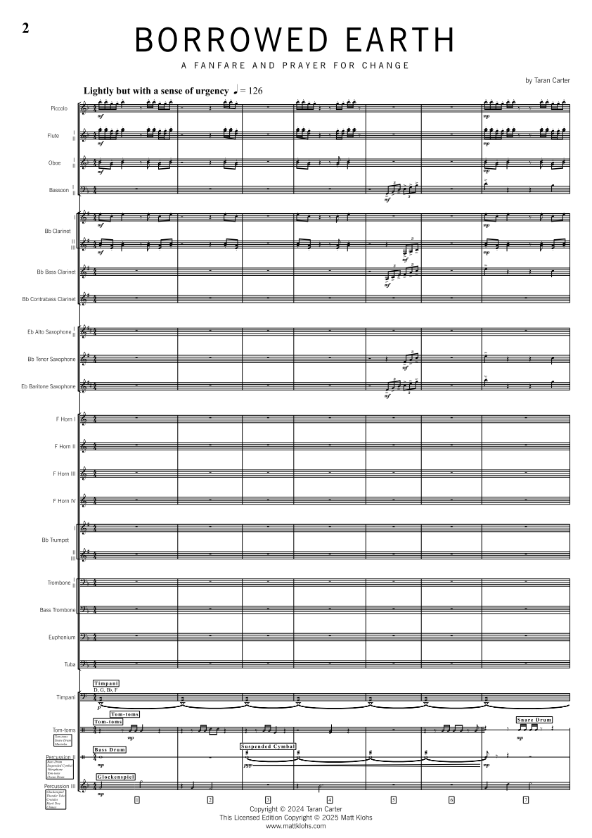 "Borrowed Earth - A Fanfare and Prayer for Change" is the latest Grade 5 work from the pen of Victorian master composer Taran Carter. Here Taran presents us with a concert opener written to showcase the glorious power, precision and subtle finesse of an advanced wind ensemble.