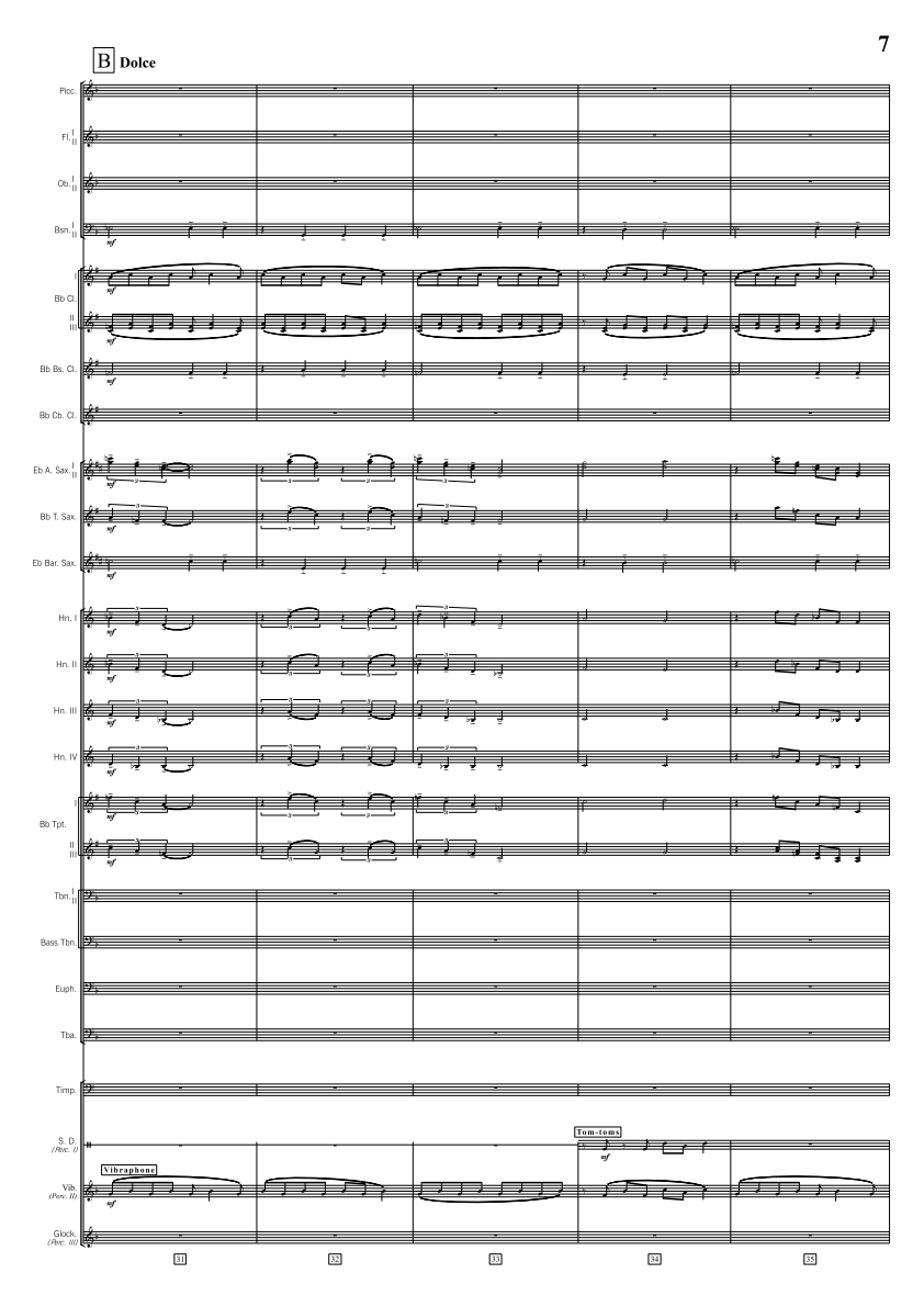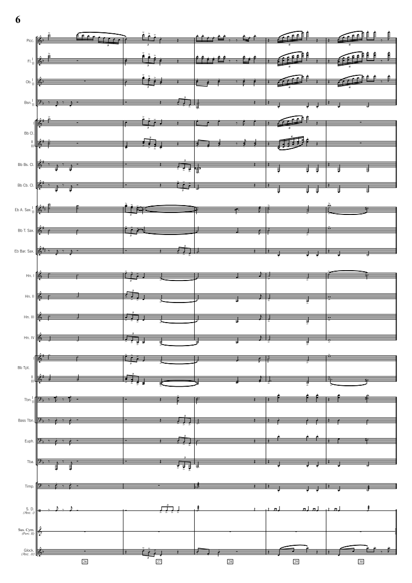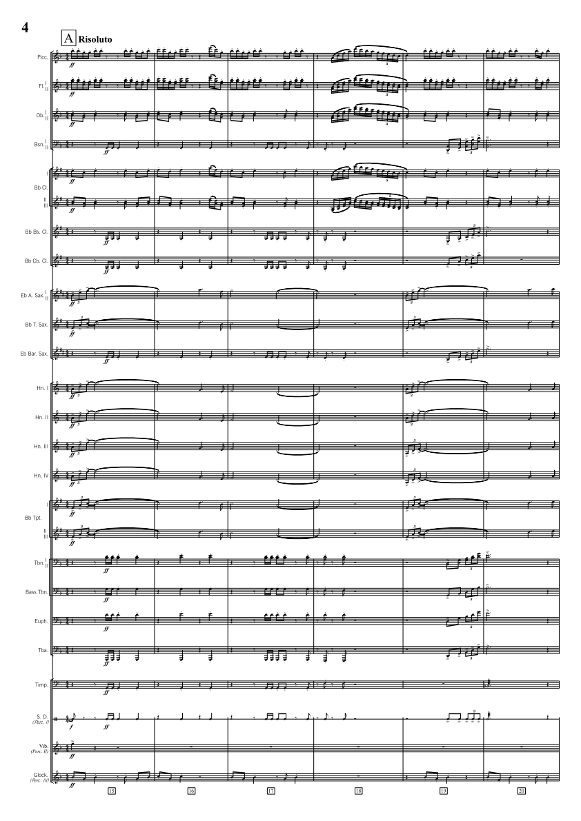Piccolo, Flute 1 2, Oboe 1 2, Bassoon 1 2, Bb Clarinet 1 2 3, Bass Clarinet, Bb Contrabass Clarinet (opt.), Alto Sax 1 2, Tenor Sax, Baritone Sax, F Horn 1 2 3 4, Bb Trumpet 1 2 3, Trombone 1 2, Bass Trombone, Euphonium (BC & TC), Tuba, Timpani, Rain Stick, Tom-toms, Snare Drum, Marimba, Bass Drum, Suspended Cymbal, Vibraphone, Ocean Drum, Glockenspiel, Thunder Tube, Crotales, Mark Tree, Chimes
