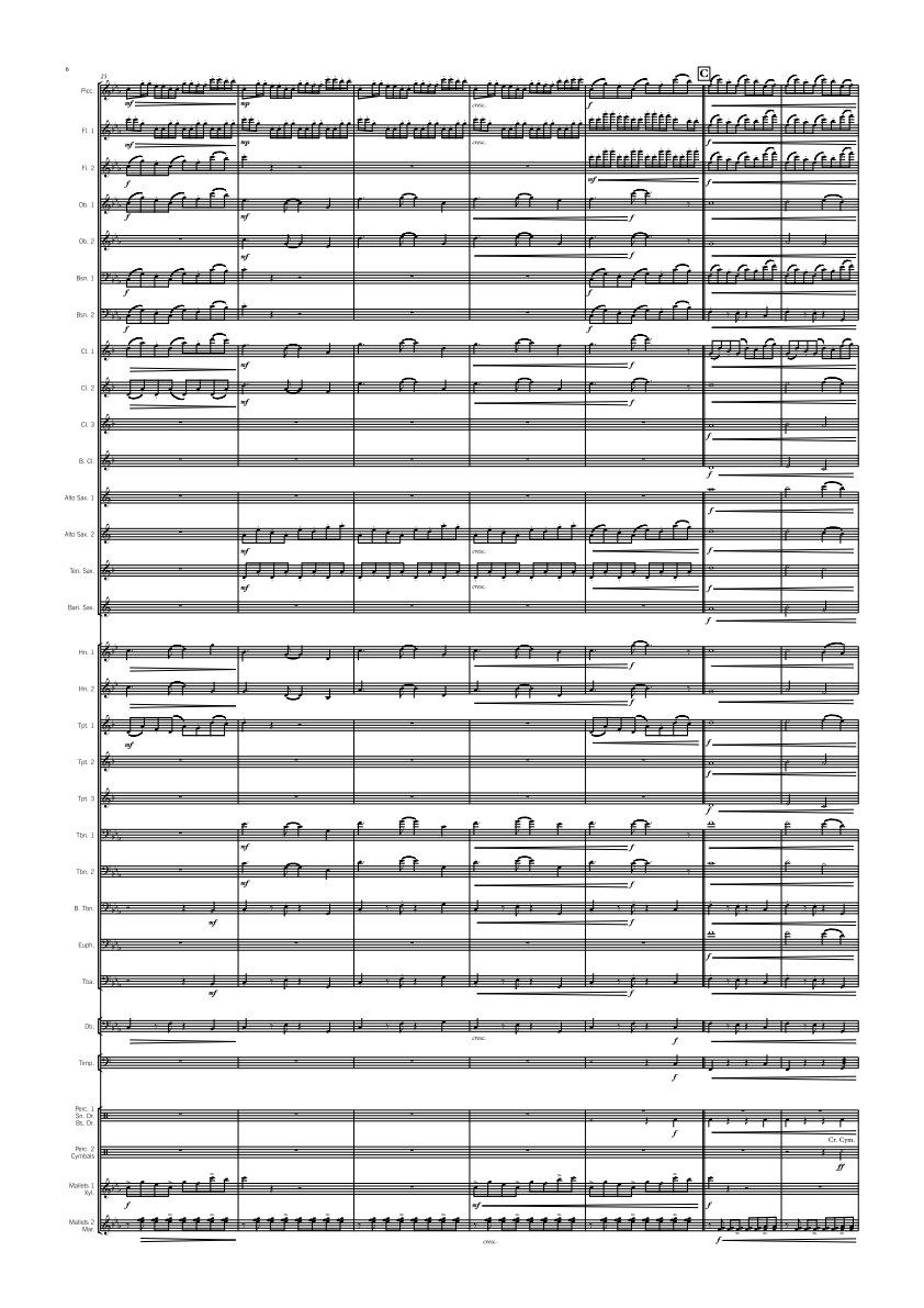Instrumentation: Picc, Fl 1 2, Oboe 1 2, Bassoon 1 2, Bb Cl 1 2 3, Bs Cl, A Sax 1 2, T Sax, B Sax, Bb Tpt 1 2 3, F Hns 1 2, Trom 1 2, Bass Trom, Eupho, Tuba, Double Bass, Percussion (Tympani, Bass Drum, Snare Drum, Triangle, Crash Cymbals, Sus Cymbal, Glockenspiel, Xylophone, Marimba)