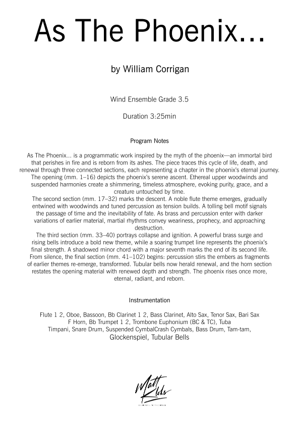 As The Phoenix... is a programmatic work inspired by the myth of the phoenix—an immortal bird that perishes in fire and is reborn from its ashes. The piece traces this cycle of life, death, and renewal through three connected sections, each representing a chapter in the phoenix’s eternal journey.