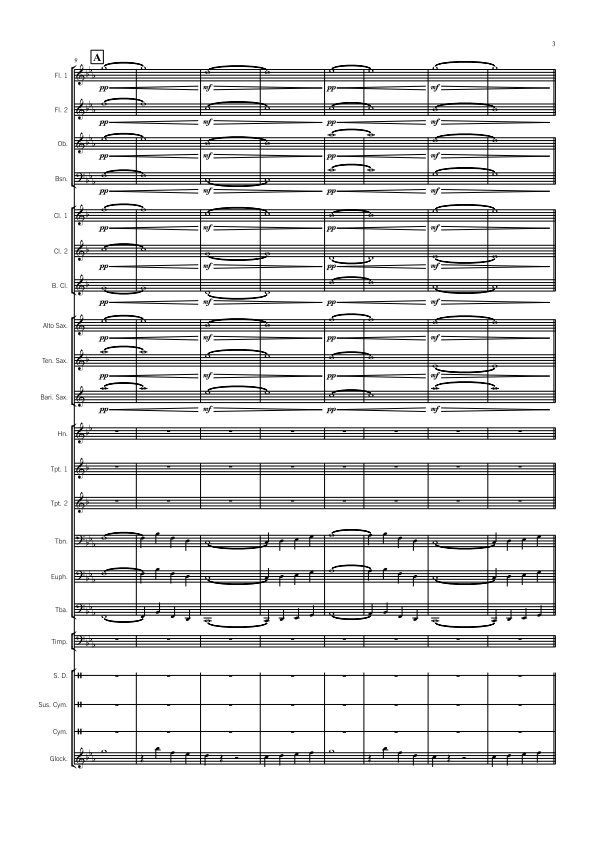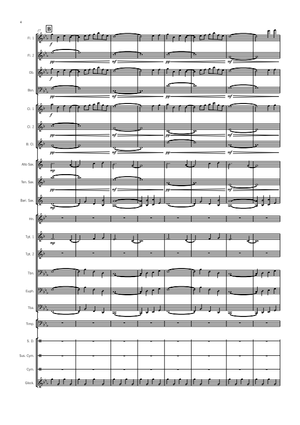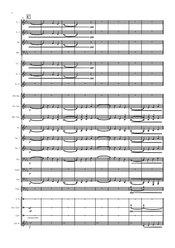 Flute 1 2, Oboe, Bassoon, Bb Clarinet 1 2, Bass Clarinet, Alto Sax, Tenor Sax, Bari Sax, F Horn, Bb Trumpet 1 2, Trombone Euphonium (BC & TC), Tuba, Timpani, Snare Drum, Suspended Cymbal, Crash Cymbals, Bass Drum, Tam-tam, Glockenspiel, Tubular Bells