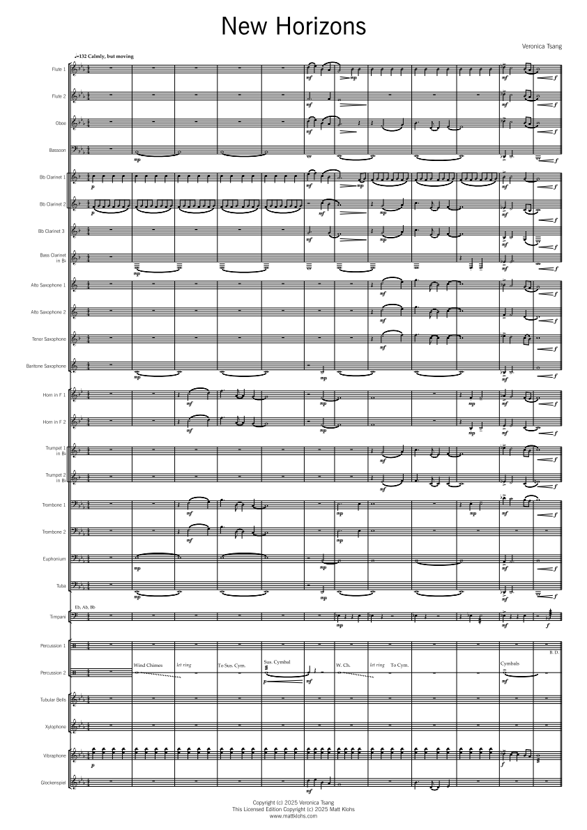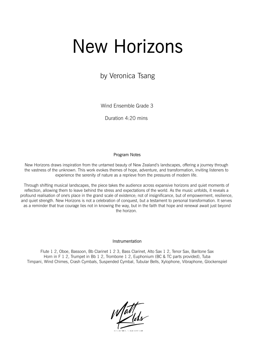 Through shifting musical landscapes, the piece takes the audience across expansive horizons and quiet moments of reflection, allowing them to leave behind the stress and expectations of the world. As the music unfolds, it reveals a profound realisation of one's place in the grand scale of existence; not of insignificance, but of empowerment, resilience, and quiet strength. New Horizons is not a celebration of conquest, but a testament to personal transformation. It serves as a reminder that true courage lies not in knowing the way, but in the faith that hope and renewal await just beyond the horizon.