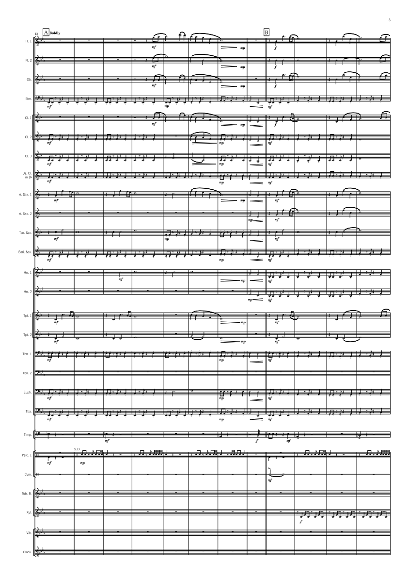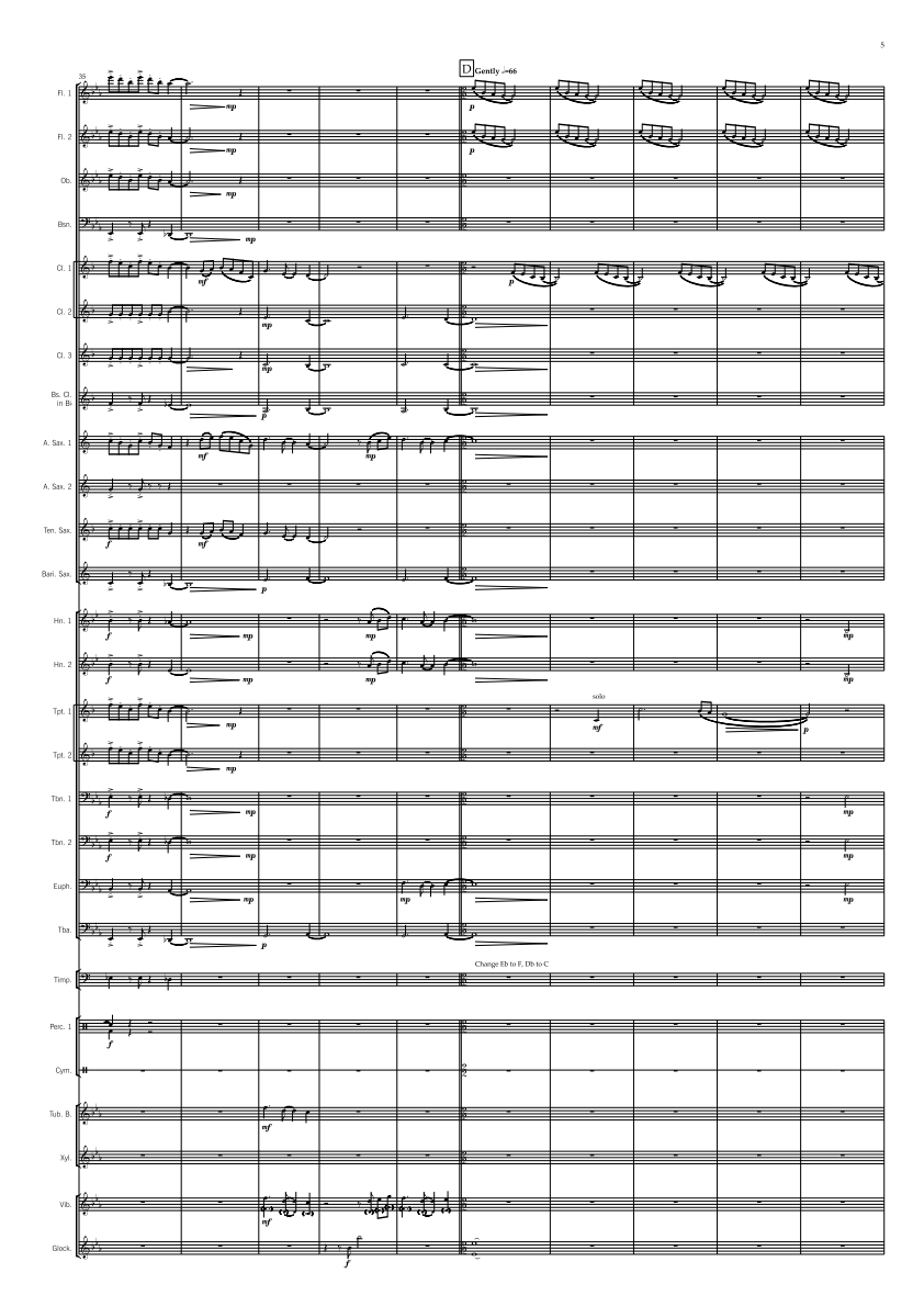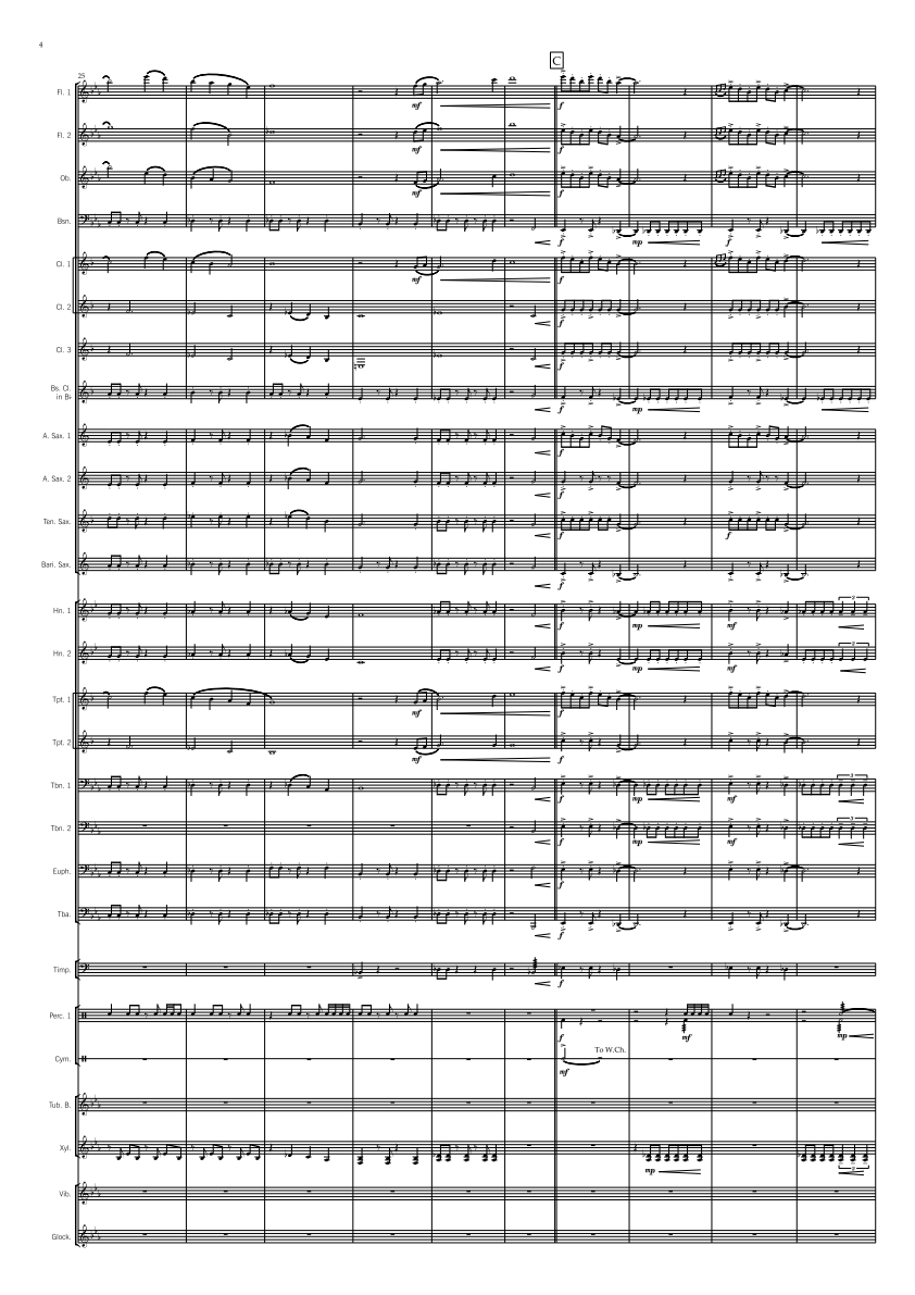 Flute 1 2, Oboe, Bassoon, Bb Clarinet 1 2 3, Bass Clarinet, Alto Sax 1 2, Tenor Sax, Baritone Sax, Horn in F 1 2, Trumpet in Bb 1 2, Trombone 1 2, Euphonium (BC & TC parts provided), Tuba, Timpani, Wind Chimes, Crash Cymbals, Suspended Cymbal, Tubular Bells, Xylophone, Vibraphone, Glockenspiel