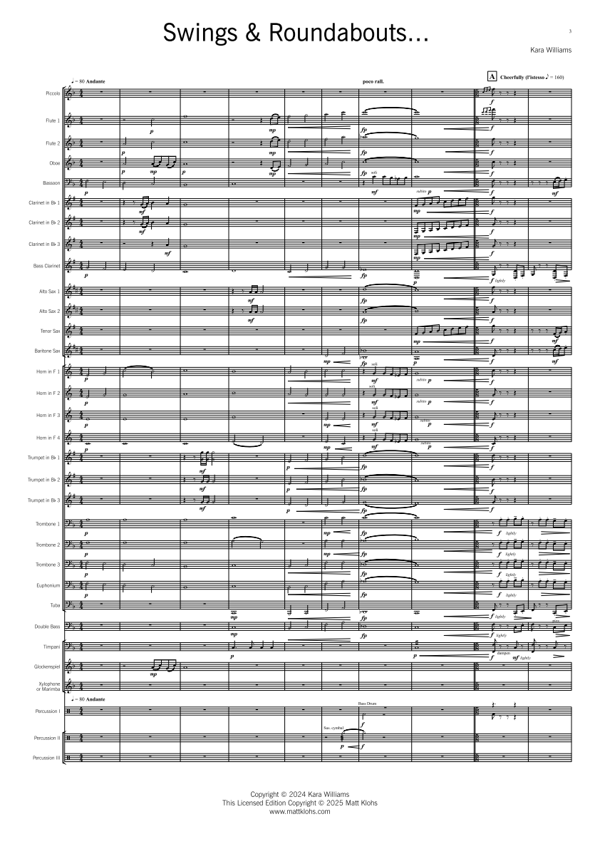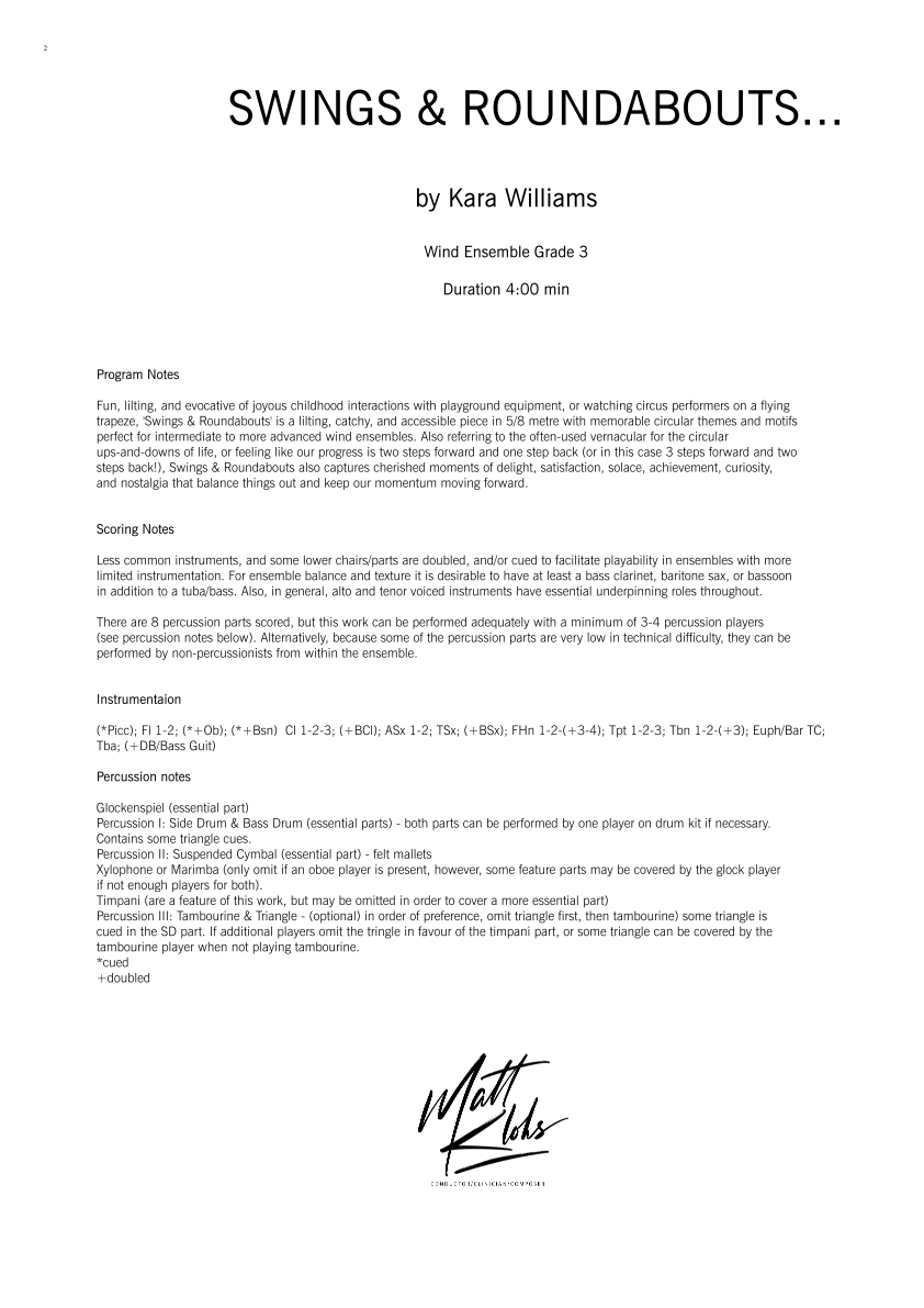 Fun, lilting, and evocative of joyous childhood interactions with playground equipment, or watching circus performers on a flying trapeze, 'Swings & Roundabouts' is a lilting, catchy, and accessible piece in 5/8 meter with memorable circular themes and motifs perfect for intermediate to more advanced wind ensembles. Also referring to the often-used vernacular for the circular ups-and-downs of life, or feeling like our progress is two steps forward and one step back (or in this case 3 steps forward and two steps back!), Swings & Roundabouts also captures cherished moments of delight, satisfaction, solace, achievement, curiosity, and nostalgia that balance things out and keep our momentum moving forward.