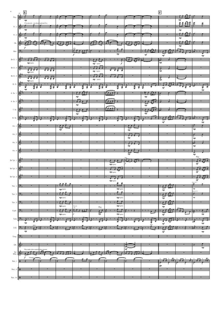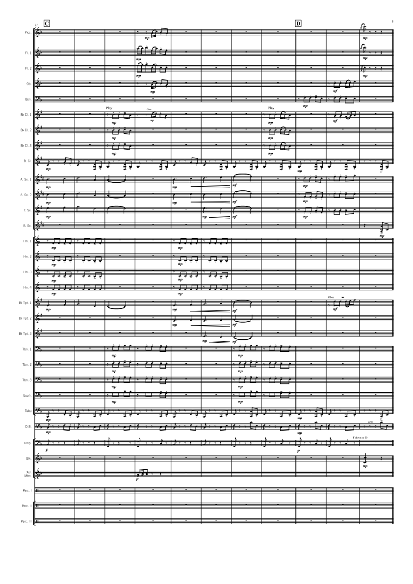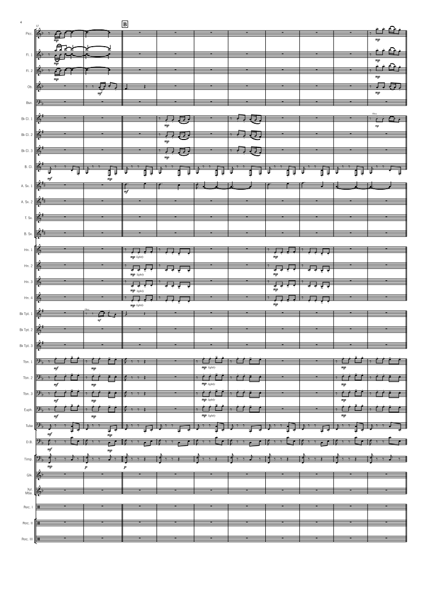 (*Picc); Fl 1-2; (*+Ob); (*+Bsn) Cl 1-2-3; (+BCl); ASx 1-2; TSx; (+BSx); FHn 1-2-(+3-4); Tpt 1-2-3; Tbn 1-2-(+3); Euph/Bar TC; Tba; (+DB/Bass Guit)