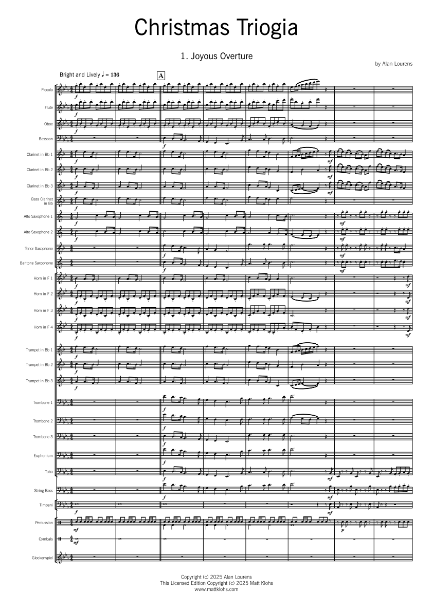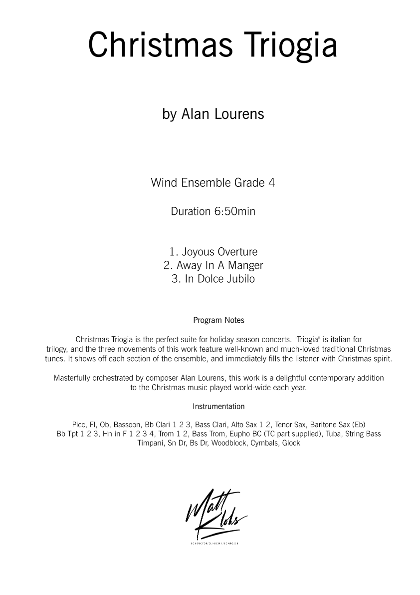 Christmas Triogia is the perfect suite for holiday season concerts. "Triogia" is Italian for trilogy, and the three movements of this work feature well-known and much-loved traditional Christmas tunes. It shows off each section of the ensemble, and immediately fills the listener with Christmas spirit. Masterfully orchestrated by composer Alan Lourens, this work is a delightful contemporary addition to the Christmas music played world-wide each year.