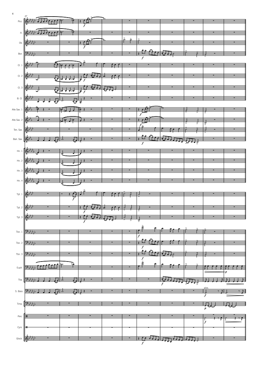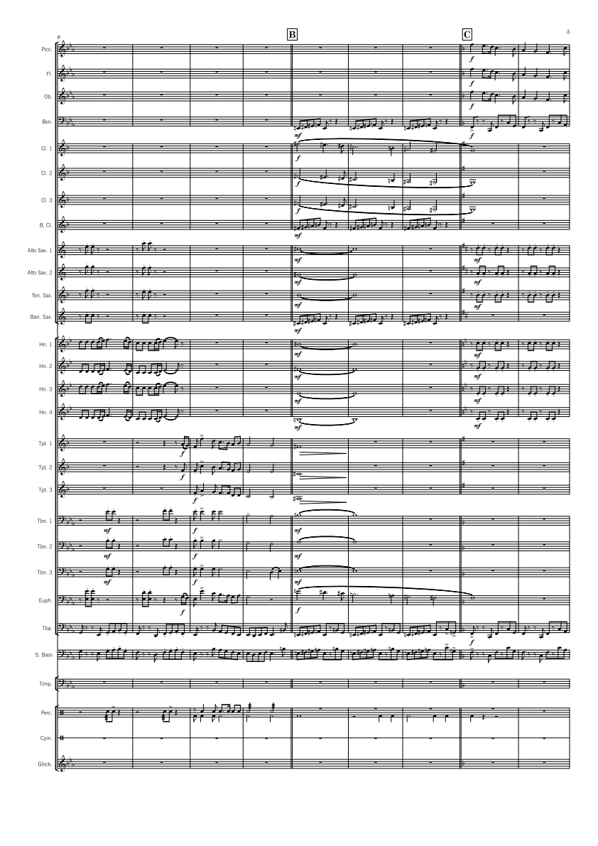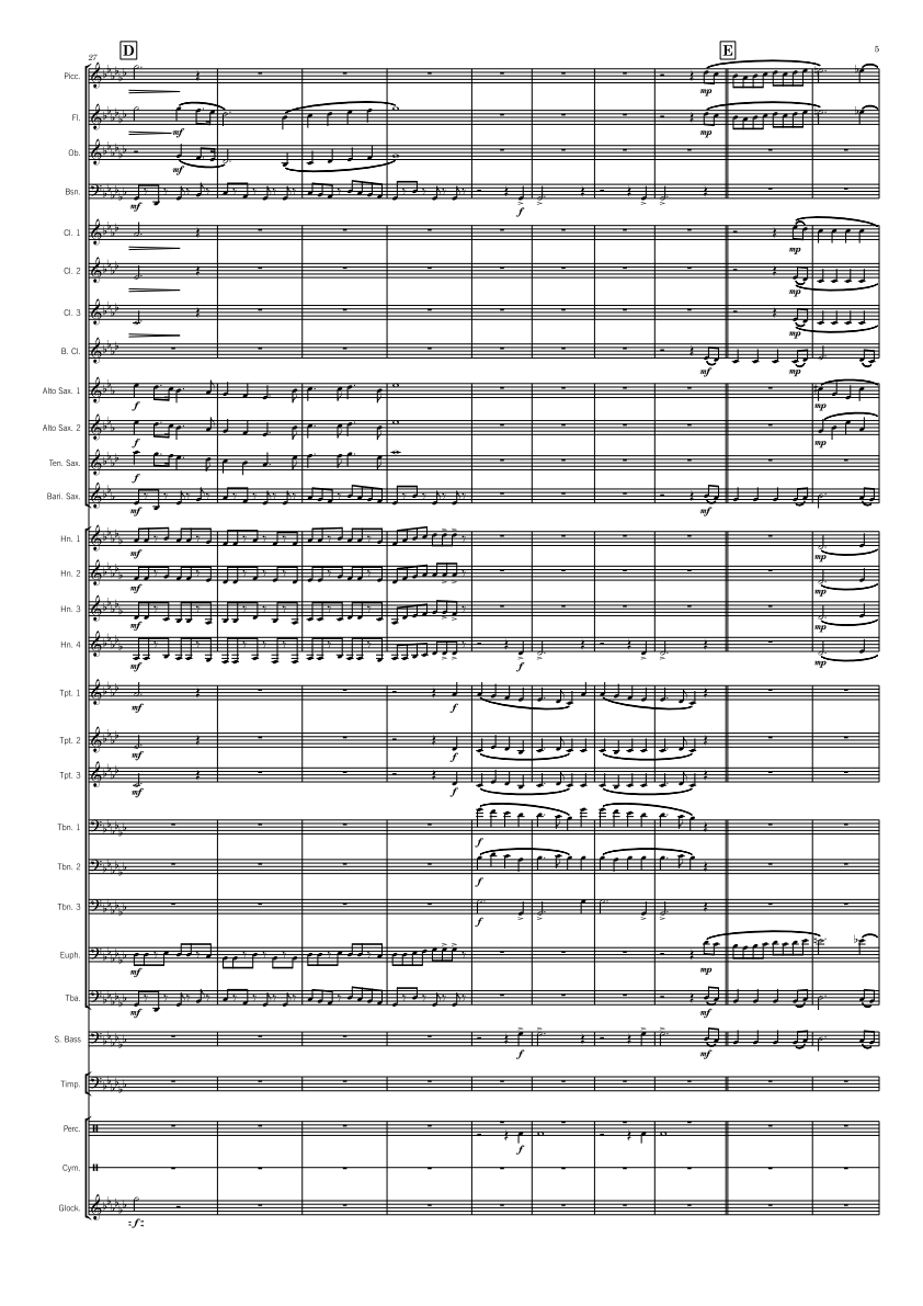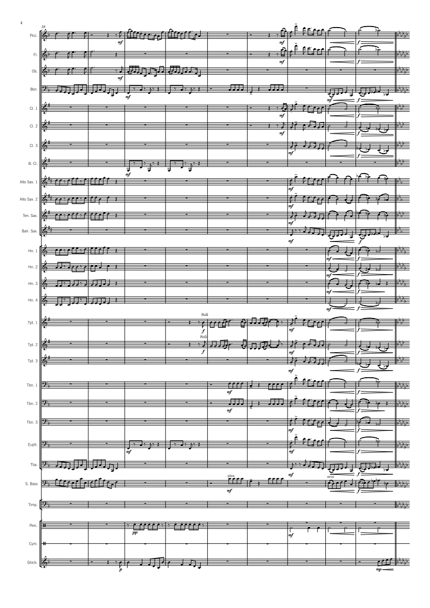 Picc, Fl, Ob, Bassoon, Bb Clari 1 2 3, Bass Clari, Alto Sax 1 2, Tenor Sax, Baritone Sax, Bb Tpt 1 2 3, Hn in F 1 2 3 4, Trom 1 2, Bass Trom, Eupho BC (TC part supplied), Tuba, String Bass, Timpani, Sn Dr, Bs Dr, Woodblock, Cymbals, Glock