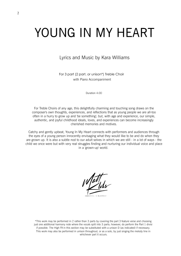 For Treble Choirs of any age, this delightfully charming and touching song draws on the composer's own thoughts, experiences, and reflections that as young people we are all-too often in a hurry to grow up and 'be something'; but, with age and experience, our simple, authentic, and joyful childhood ideals, loves, and experiences can become increasingly cherished memories and motives. Catchy and gently upbeat, Young In My Heart connects with performers and audiences through the eyes of a young person innocently envisaging what they would like to be and do when they are grown up. It is also a subtle nod to our adult selves in which we are still - in a lot of ways - the child we once were but with very real struggles finding and nurturing our individual voice and place in a 'grown-up' world. - KW